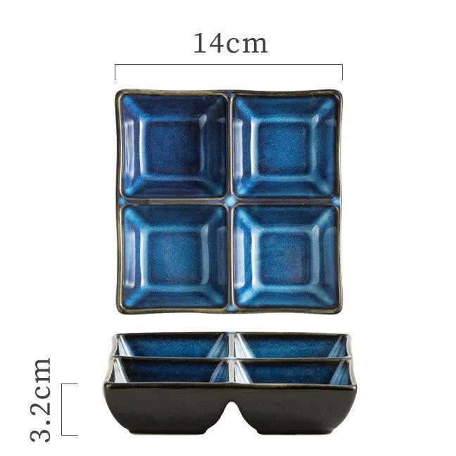 This square condiment plate features four distinct compartments, perfect for barbecue sauces, appetizers, spices, and dipping assortments. Its underglaze finish adds smoothness and vibrancy, while the bold colors bring personality to any table.
