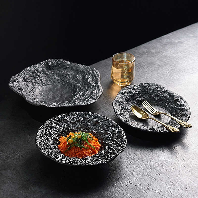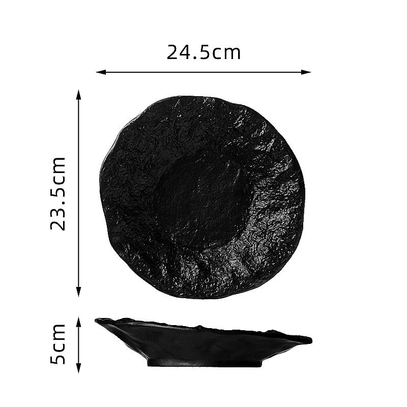 This bold ceramic soup plate features a striking rock-textured glaze that adds depth and personality. With its generous depth and sculptural shape, it’s perfect for hearty soups, pastas, salads, or chef-style plating.