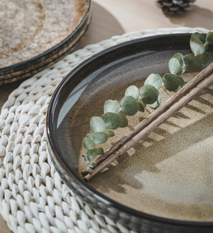 This striking plate showcases vivid kiln-inspired effects, with glazes resembling tiger skin glaze, leopard glaze, and metallic black. The bold patterns make it an eye-catching piece for creative food presentation.